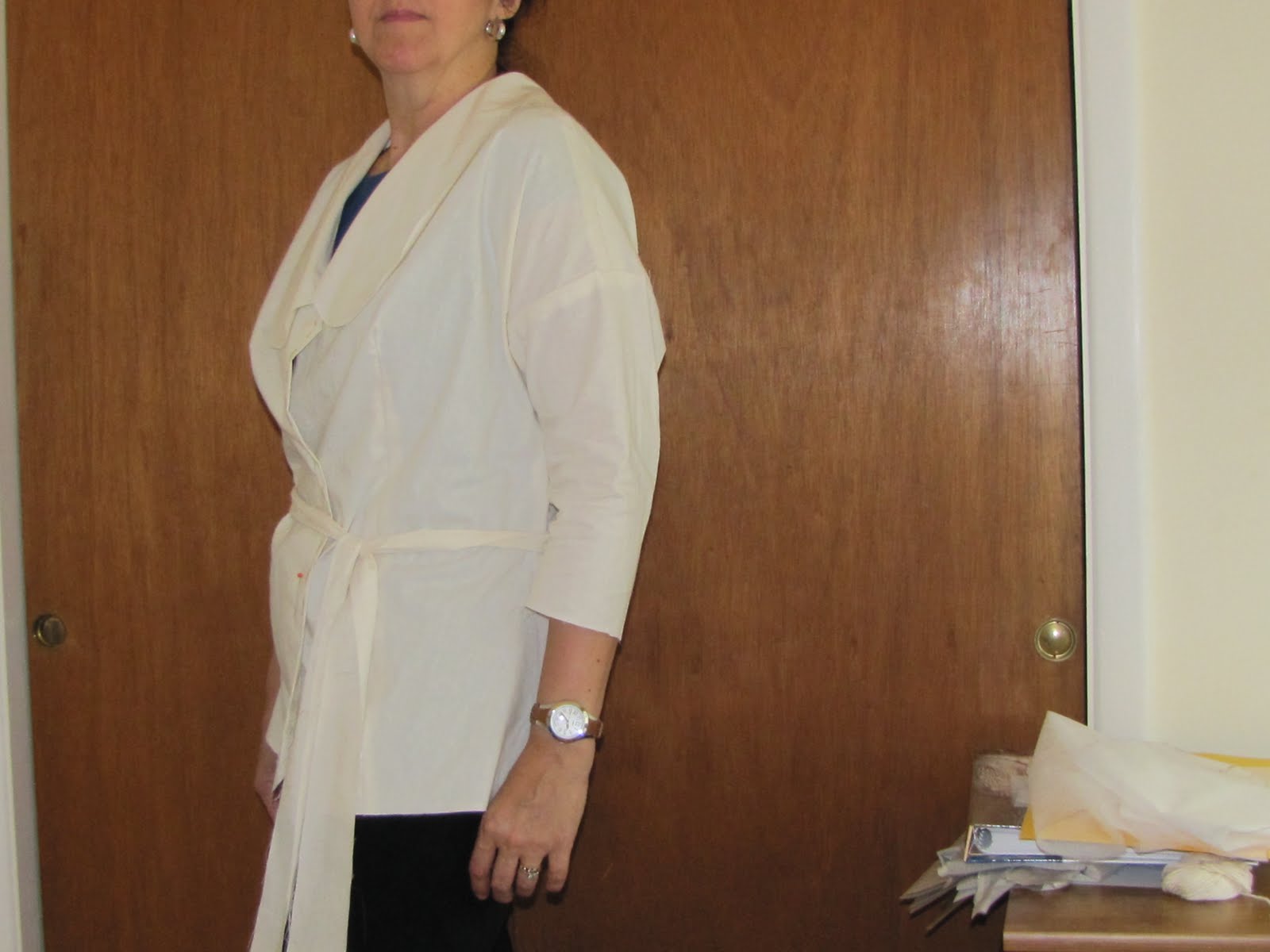 Patternreview. One review mentioned no problems, others problems matching up the shoulder seam and notches on the sleeve and problems with the length of the sleeve. Thinking about it all I traced for my size, a combination of 10 and 14 and cut it the muslin. I did add to the back waist length, I figure I could always pinch it out if I didn't need it.